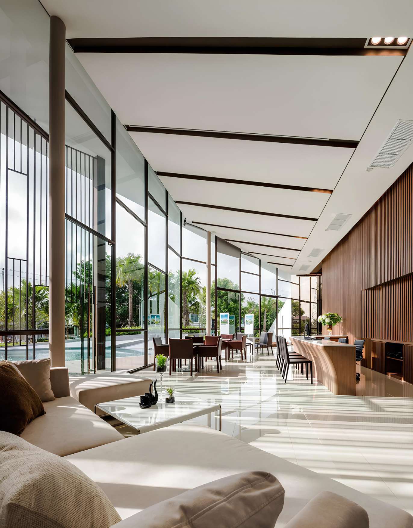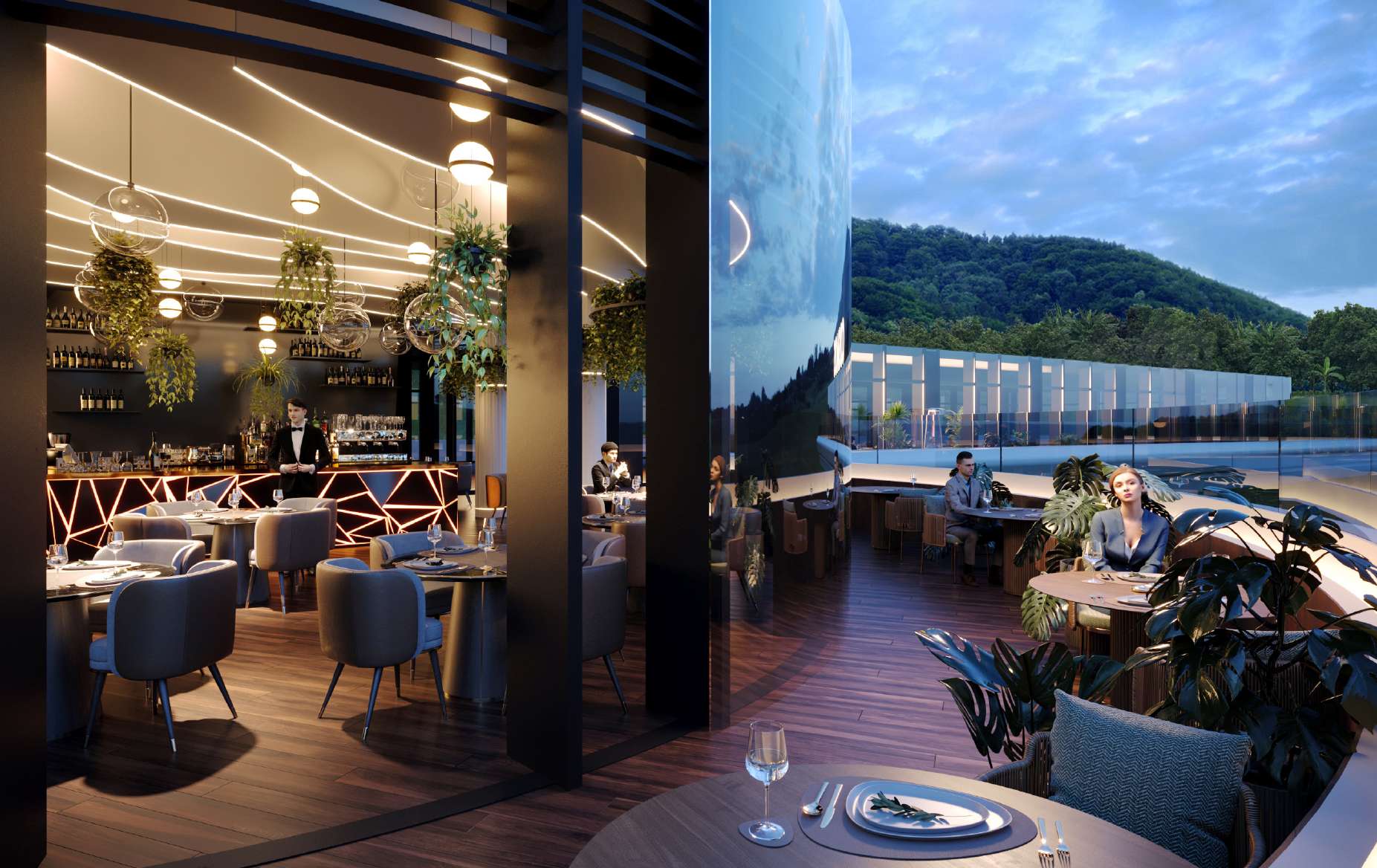 Бионические формы фасадов повторяют изгибы морской волны. Панорамное остекление Pilkington Suncool™ обеспечивает максимальный обзор и защиту от ультрафиолета. Отделка натуральным травертином и латунью.