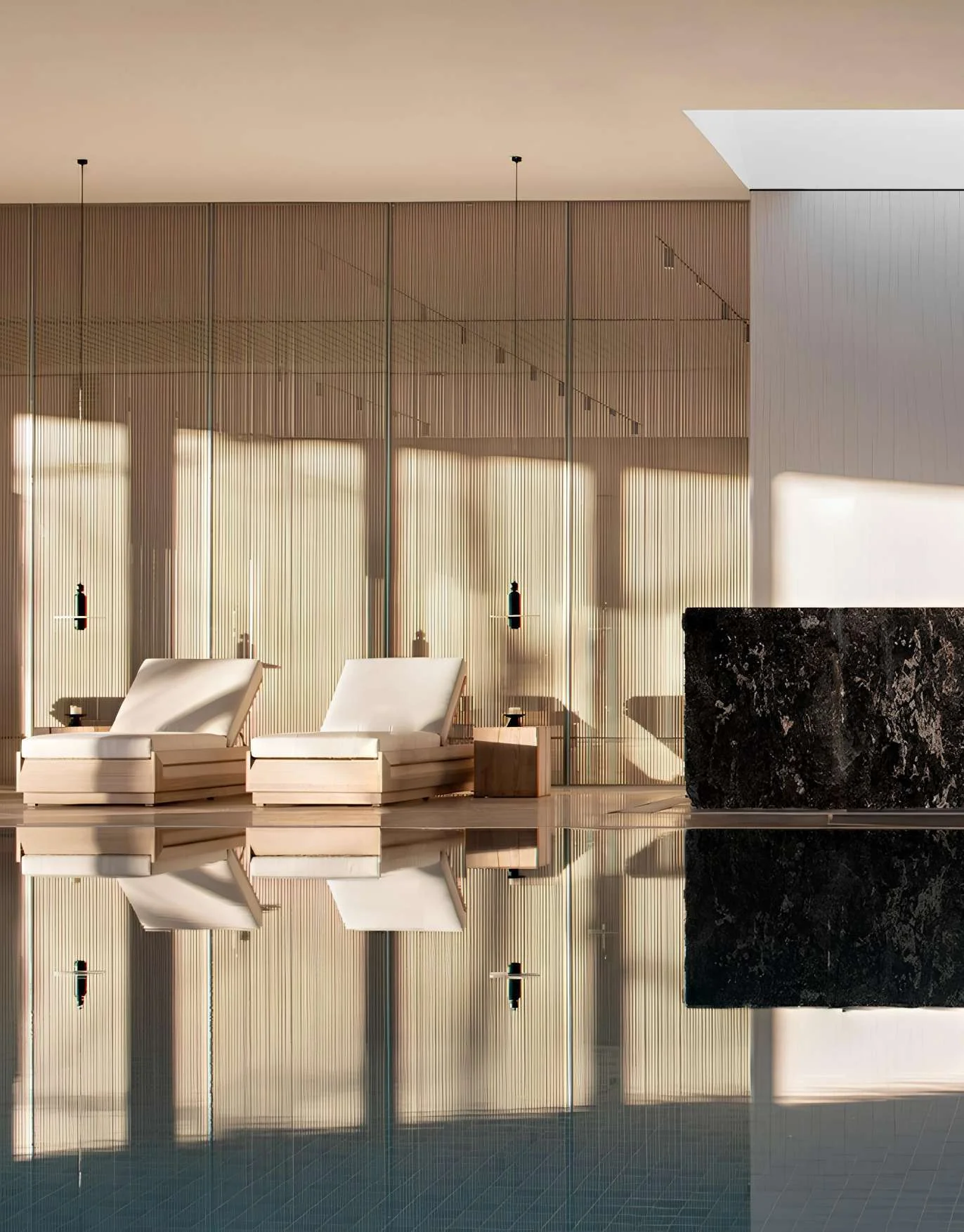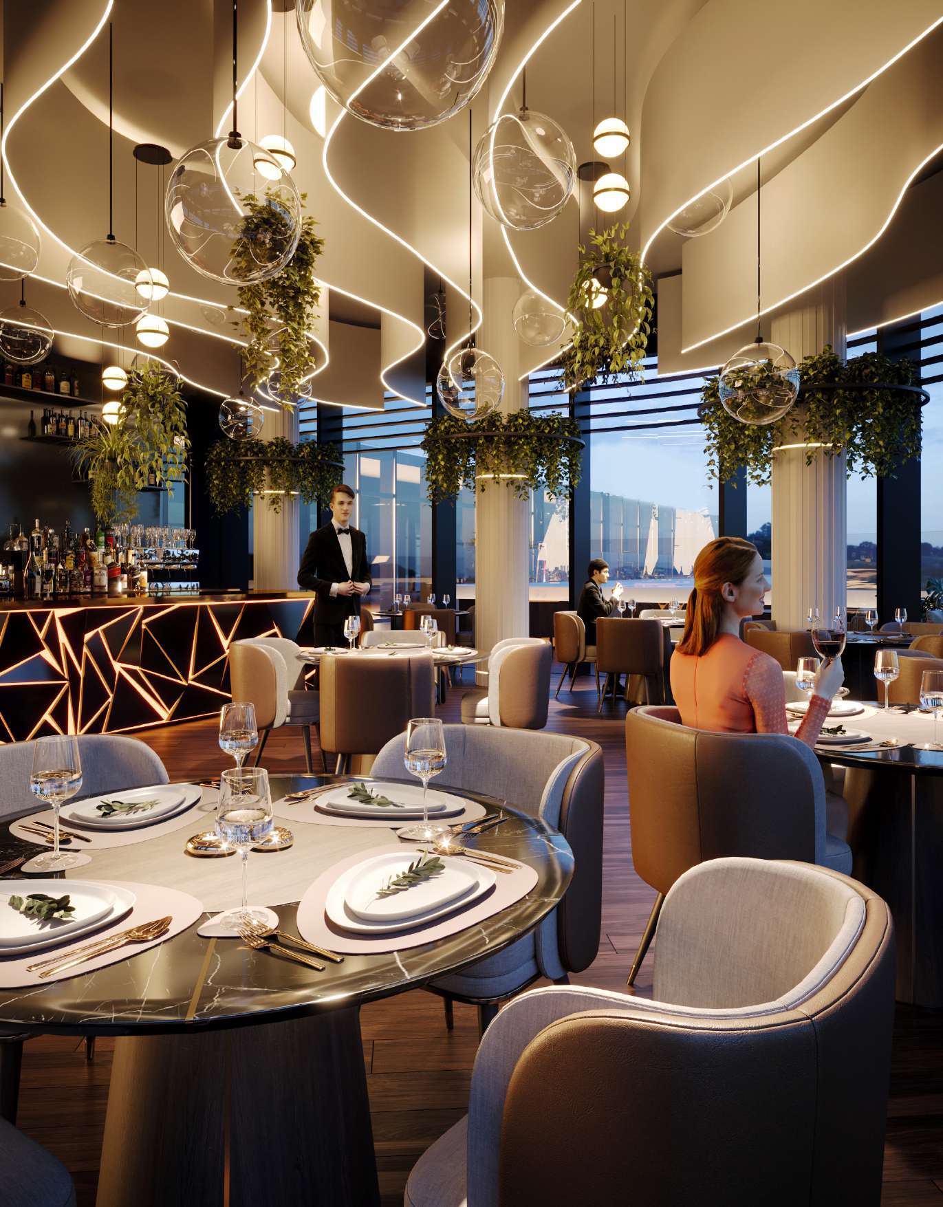 Бионические формы фасадов повторяют изгибы морской волны. Панорамное остекление Pilkington Suncool™ обеспечивает максимальный обзор и защиту от ультрафиолета. Отделка натуральным травертином и латунью.